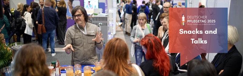 Unser Format Snacks and Talks - für ein "Häppchen" zwischendurch: Unsere Partner bieten an ihren Ständen in der Ausstellung kleine Stärkungen und kurze Talks zu verschiedenen spannenden Themen. Für die Snacks wie die Inhalte gilt: klein, aber nahrhaft - die BGW bringt beispielsweise in der Kochshow "Küchen der Welt" Vielfalt auf den Teller, während der Verband der Schwesternschaften vom Deutschen Roten Kreuz e.V. u.a. diskutiert, wie er gemeinsam mit dem Sanitätsdienst der Bundeswehr zur Versorgung und Resilienz der Bevölkerung in Krisenzeiten beitragen kann.