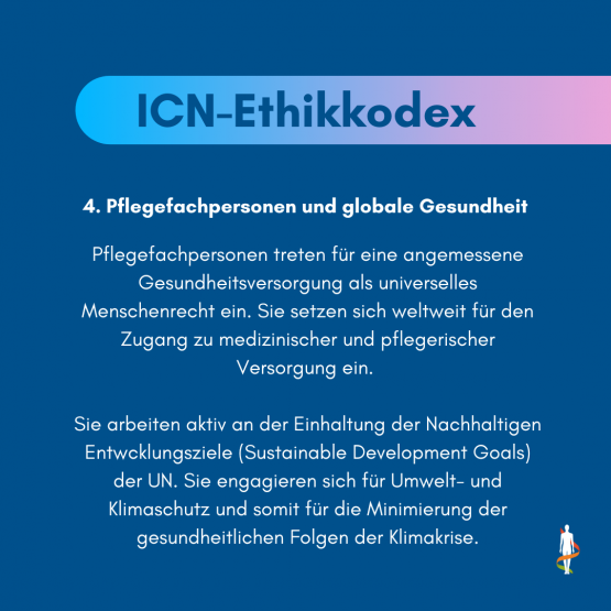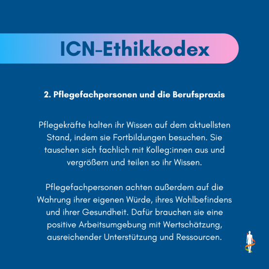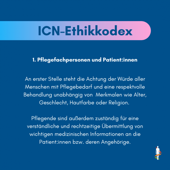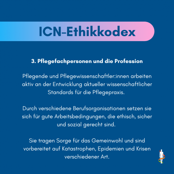 Ein Ethikkodex für die Pflege: Seit 1953 definiert der ICN - International Council of Nurses - Leitlinien für die Profession. Der Ethikkodex beruht auf der Feststellung, dass Pflege untrennbar mit Menschenrechten, globaler Gesundheit und sozialer Gerechtigkeit verbunden ist und gibt ethische Orientierung zu Fragestellungen der pflegerischen Praxis.